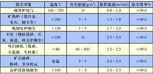 除塵器選用 LDML型及LDMM型除塵器屬大中型除塵器,一般適用于爐窯煙氣除塵,露天放置。 LDMS型除塵器屬于小型除塵器,一般適用于礦石破碎、粉碎、篩分、轉(zhuǎn)運過程的除塵,室外內(nèi)放置。選型所根據(jù)的有關(guān)參數(shù)如下: 1、 過濾速度及除塵效率 過濾速度是除塵器選型的關(guān)鍵因素,應(yīng)根據(jù)煙塵或粉塵的性質(zhì)、應(yīng)用場合、灰塵粒度、氣體溫度、含塵濃度等因素來確定。綜合這些條件列出離線清灰脈沖袋式除塵器對幾種煙塵和粉塵的適用過濾速度推薦值,見下表。