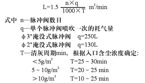2、過濾材料 離線清灰脈沖袋式除塵采用針刺毯濾袋,當用戶無特殊要求時,一般根據(jù)入品氣體溫度而使用以下材料。常溫或<130℃時,500g/m2滌綸針刺毯. 130-250℃時,800g/m2緯雙重織玻纖織物或800g/m2玻纖針刺毯、諾梅克斯針刺毯。 3、壓縮空氣耗量(L) 清灰用壓縮空氣耗量按下式計算: