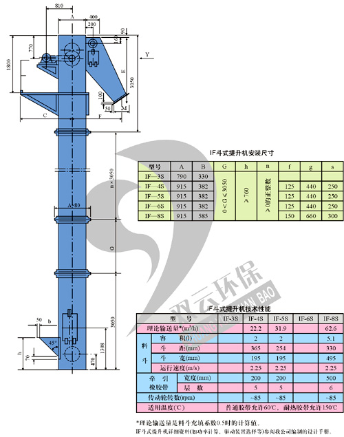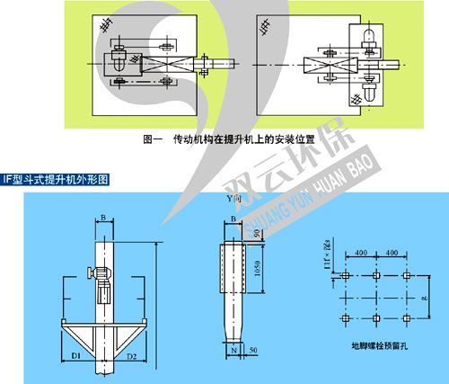 4、 根據(jù)用戶需要,本提升機(jī)的進(jìn)料口、出料口的大小、形狀、在機(jī)殼上的安裝位置以及檢修平面的大小可以在一定范圍里變動。